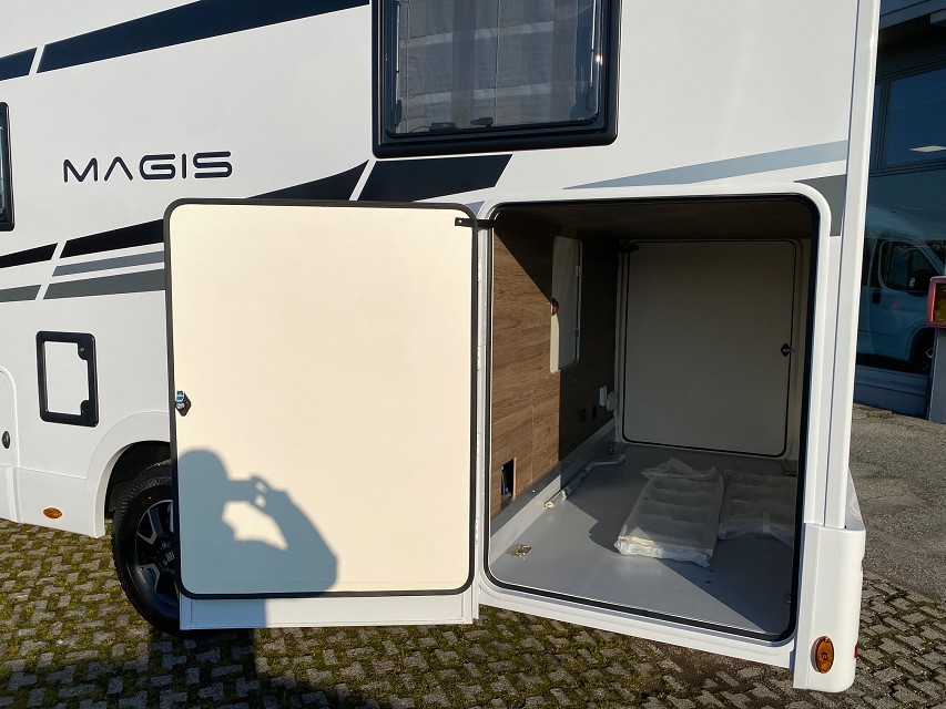 - cerchi in lega da 16″ bicolor, volante e cambio in pelle, Techno Dashboard, TPMS, freno a mano elettrico, porta cellula XL a 2 punti di chiusura con finestra fissa e chiusura centralizzata, pannello solare 200W con regolatore MPPT, oscuranti cabina plissettati, veranda, presa esterna gas e presa acqua con doccino nel garage